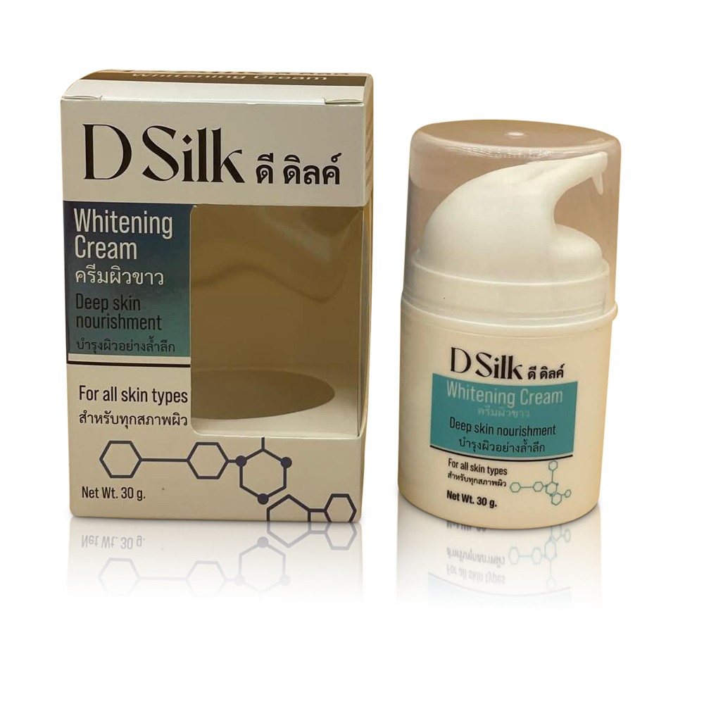 The D Silk Whitening Cream is formulated to reduce dark spots caused by sun exposure and even out skin tone on the face and neck. It is enriched with powerful antioxidants and moisturizing properties that also help diminish the appearance of fine lines and wrinkles, leading to a smoother and more radiant complexion.